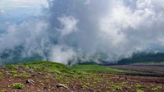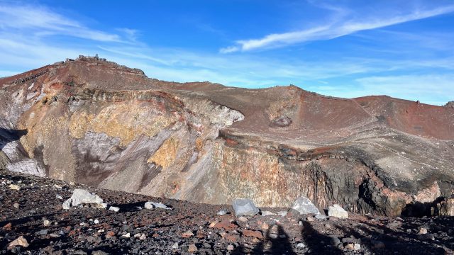 We congratulated each other, took tons of pictures, spent time to just absorb the beautiful and ever-changing view, peered into the crater of the still-active volcano (where there was still some dust-covered snow), and rested for what we were told would be an even more difficult descent. I also celebrated with a glass of a hot white sake drink for sale at the summit.